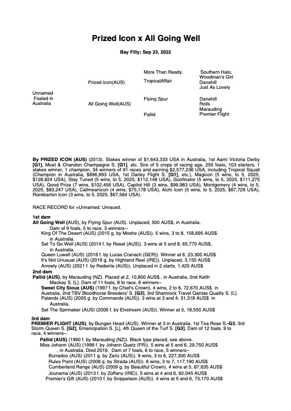 By dual Group 1 winner Prized Icon, a son of More Than Ready who combined elite juvenile form with classic stamina, capturing both the Champagne Stakes (Gr.1) and Victoria Derby (Gr.1).